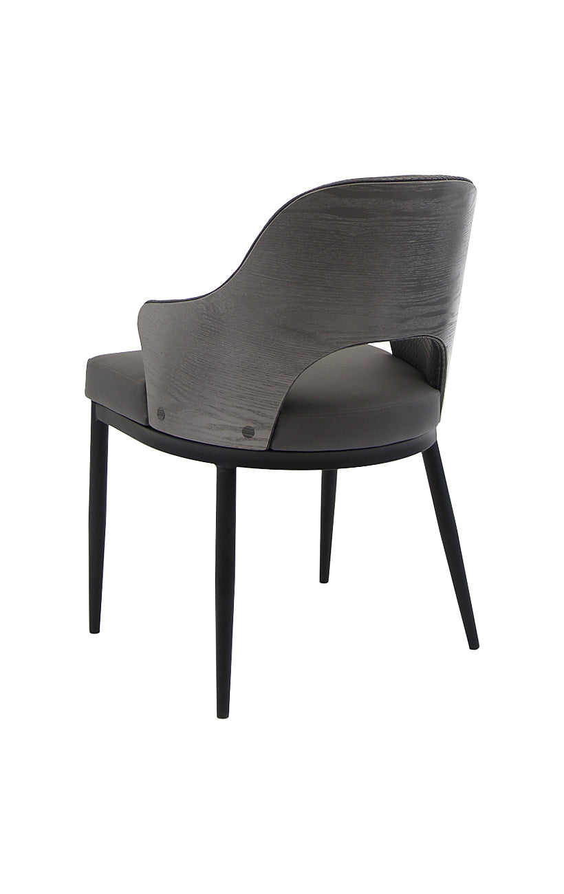 This indoor chair features a durable metal frame with a sleek black finish, providing both strength and a modern look. The seat is upholstered in dark grey vinyl, offering comfortable support and easy maintenance. Its textured backrest adds subtle visual interest while enhancing comfort. Ideal for professional or residential settings, this chair balances style and practical functionality.