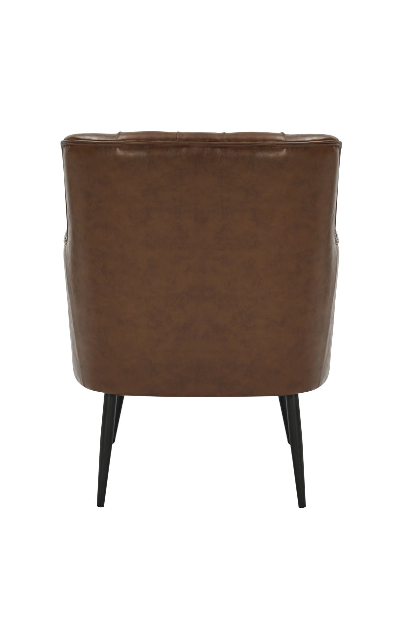 Designed for indoor use, this vintage-style metal arm chair combines durability with comfort. Its sturdy black metal frame ensures long-lasting support, while the brown tufted vinyl seat and back provide cushioned comfort and a classic aesthetic. Ideal for adding a sophisticated touch to your living or dining space, this chair offers both style and practicality with easy-to-clean materials and a timeless design.